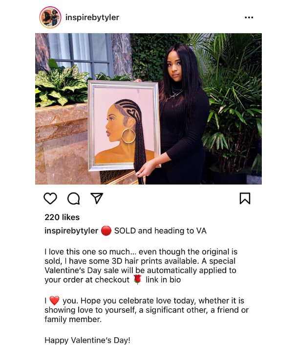 Tyler Clark has taken paint on canvas to a new dimension. She makes art 3D by attaching real synthetic hair and other accessories, a unique feature that has led her to create artwork for Chance the Rapper, Common, Issa Rae, and Taraji P. Hensen. Clark also works in 2D but is especially known for her ability to showcase the beauty of Black women through these 3D pieces. She also makes
