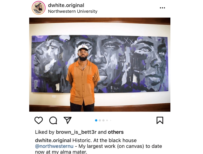 A multi-disciplinary creative, Dwight White II conveys his love for people and insights through his canvas paintings and large-scale murals. The former Northwestern University football player’s work can be described as “spontaneous realism,” with characters and colors acting as a direct expression of his emotions and thoughts. In 2020, White painted a